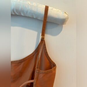 Features: Soft jersey fabric with a stretchy feel, scoop neckline, thin adjustable shoulder straps, strappy crisscross back detail, gusset snap button closure with thong back.