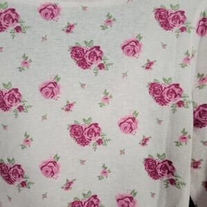 Free People Intimately FP thermal waffle-knit henley bodysuit in a pink rose floral print. Features a soft stretchy cotton blend, scoop neckline with button-front placket, long sleeves, and snap-closure bottom. Feminine cottagecore aesthetic meets cozy everyday comfort.