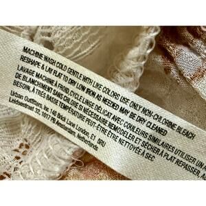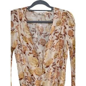 Designed in a sheer floral print with rose tones, it features long bell sleeves, a deep V-neckline, and delicate lace trim at the bottom. Perfect for layering with jeans, skirts, or under blazers for an effortlessly chic look. Women’s size Small.