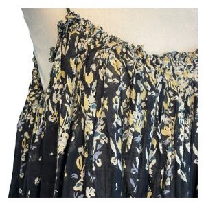 Intimately FP for Free People Instant Crush Camisole Top in Black with Yellow, Blue and Cream Flower Pattern. It features a Roomy Body that flows out from the Pleated Ruffled Scoop Neck neckline to a cool Cropped Hem. Adjustable straps let you change up the length to suit your figure.
