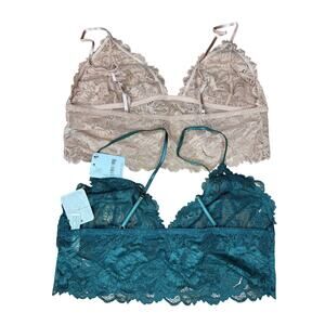 Beautiful Free People Intimately lace bralettes in size Large, one in a soft blush nude and one in a rich evergreen/teal. Both are NWT. These bralettes feature delicate floral lace, a flattering triangle silhouette, adjustable straps, and a stretchy longline band for an easy, comfortable fit. Perfect for layering under sweaters, oversized tees, or open knits.
