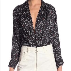Intimately by Free People Ladylike Lady Bodysuit Black Multi, Size Small. New without tags. Draped long sleeve bodysuit featuring a plunging neckline and a slouchy, relaxed fit. Hook and eye closure at bust. Mesh thong bottom. Lined at gusset. Snap buttons at gusset. Button cuffs. Fabrics: 100% Polyester; Bottom: 90% Nylon 10% Spandex.