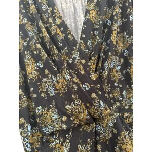 Black long sleeve body suit with olive green and light blue floral pattern. Deep V splice neck. Gathers at the shoulders and at the waist. Thong bottom has snap closure. No tags but panty liner still attached.
