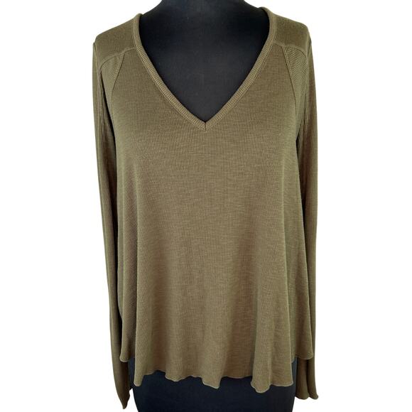 Free People Intimately Olive Green Ribbed Knit Deep V Neck Long Slv Top Large L