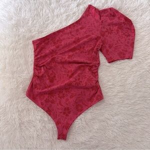 Flatter your figure with bold femininity in the One Love Bodysuit by Free People Intimately. This vibrant berry red bodysuit features a tonal floral jacquard print, a single puff sleeve for asymmetrical drama, and soft stretch construction for a sleek silhouette.