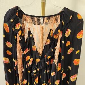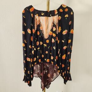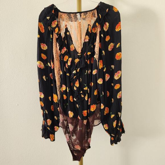 Free People Intimately Poppy Printed Bodysuit Womens Size Large Black Floral Long Sleeve Lace