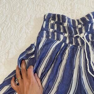 These Free People Intimately pants are perfect for lounging or a casual day out! They feature a comfortable elastic drawstring waist, a relaxed wide leg, and convenient pockets. The cropped length and flowy viscose material make them ideal for warm weather. The blue and white striped pattern adds a touch of effortless style.