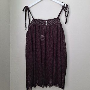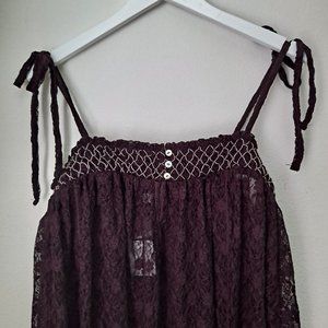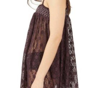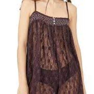 New with tags. Free People Intimately Rule The World lace romper in size L. Lovely in lace, this sheer and sultry romper is featured in a shapeless babydoll silhouette with smocked square neckline, button-up detailing and adjustable tie straps. Side slip pockets. Raw edge hemline. Exposed seams throughout. Embroidered lace fabrication. Pull-on style. Please note this is a romper, not a dress. ***Undergarments NOT included. The color is Plum Jam (dark purple) - may vary slightly in person. Approximate measurements: armpit to armpit - 19" length from top of chest band to hem - 24.5"