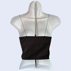 Skinny-strap seamless brami cami in black with scoop neckline and ribbed hem. Cropped, stretchy nylon-spandex for easy layering. Minimalist Y2K basic, solid color. Condition: Good.