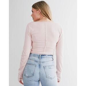 Women's Scoop Neck Bodysuit by Free People, US Size XS, Pink Color, Long Sleeve, Snap Button Front, Snap Closure at bottom, One Piece, Stretchy, Lightweight. layering piece. Classic, Office, Everyday, Casual.