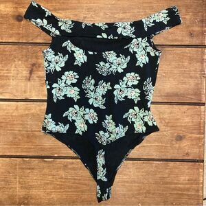 Free People Intimately black and light green floral body suit. Size medium. Off the shoulder. Cutout on the back. Thong with snap button closure. Good preowned condition.