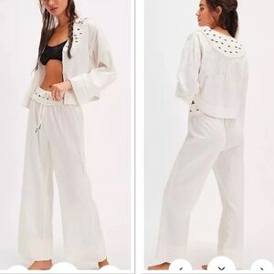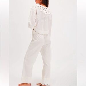 Elevate your slow-day style with this darling set from Intimately, featuring the most adorable blouse and laid-back pants, all in a lightweight textured cotton with sweet embroidered roses for a charming touch.