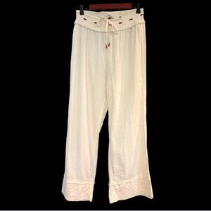 Features: Cotton searsucker fabrication; Top: Cropped, V-neckline, button-front closure, long relaxed sleeves, wide Peter Pan collar, pleated details, embroidered rosettes; Bottoms: Mid-rise, wide leg, shirred waistband with adjustable drawcord, embroidered rosettes