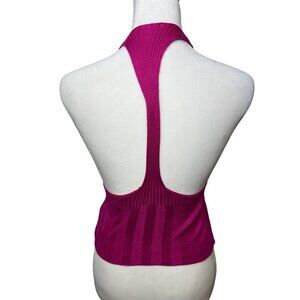 This vibrant hot pink halter tank top is crafted from a ribbed knit fabric, offering a snug yet comfortable fit. With its sleeveless design, it is a versatile piece ideal for layering or wearing alone. The ribbed texture adds an element of dimension and style, making it a staple in any wardrobe.