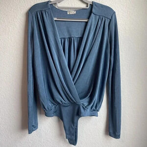 Free People Intimately Turnt Bodysuit Slate Blue Small V Neck Wrap Long Sleeve