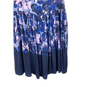 A Free People Intimately Voile Slip Dress in Midnight, a dark blue color with a pink, blue and purple floral pattern. This is a strappy, sleeveless dress made from a lightweight, unlined, Rayon. Lightly worn. In good used condition. No damage or flaws.