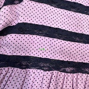 Sheer dotted slip dress with lace inset throughout the dress with a ruffled hem.