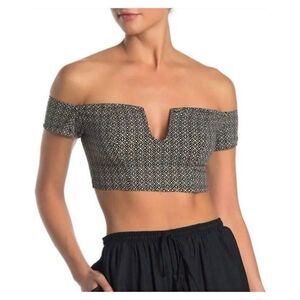 Wired V-neck crop top -Off-the-shoulder short sleeves -Slips on over head -Allover print -Fiber Content: 97% rayon, 3% spandex
