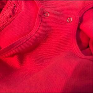 Free People Intimately Solstice Bodysuit in Candy Red. American made from stretch rib fabric, High neck, net detailing with snap closure.