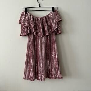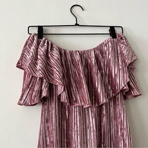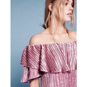 In good preowned condition. "Luxe velvet pleated mini dress featured in an off-the-shoulder silhouette with an elastic band for an easy fit. Short sleeves and a flouncy overlay along the bust."