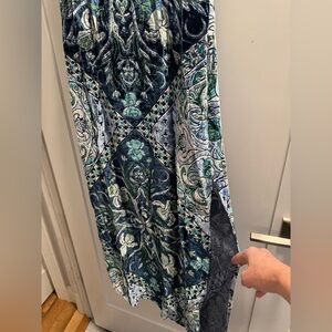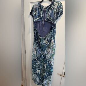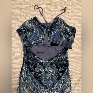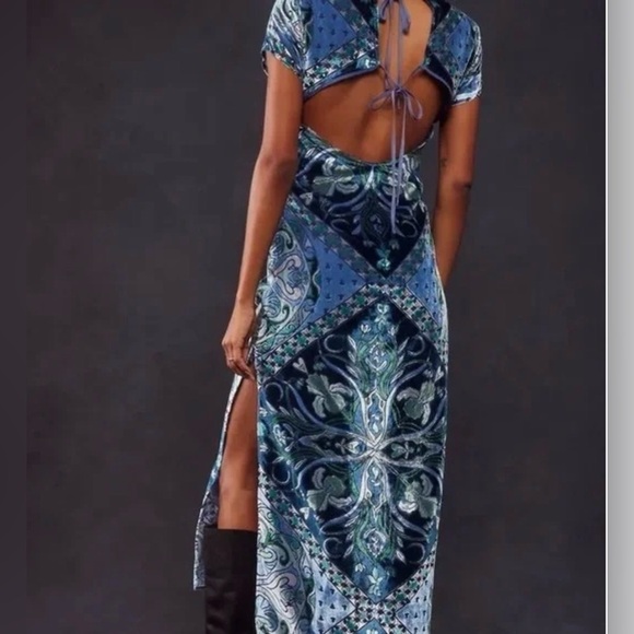 Chic backless design with intricate patterns. Vibrant blue and green hues. Perfect for making a statement.