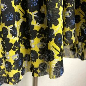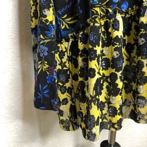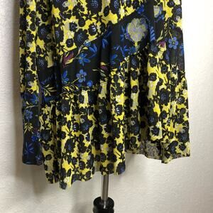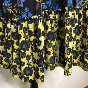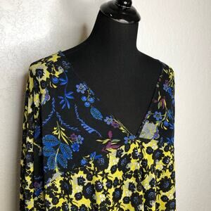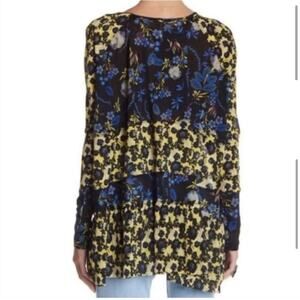 Free People Isabelle black blue yellow floral sheer baby doll tunic top. Pullover style with v neckline. Pleated tiered bottom. Semi sheer material. Long sleeves. Oversized fit. Size Small. Excellent preowned condition.