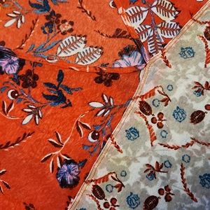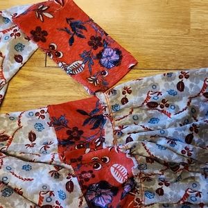 Excellent pre-owned condition red and gray floral tiered mesh boho baby doll swing top with vee neckline. 31 in pit to pit. 32 in shoulder to hem.