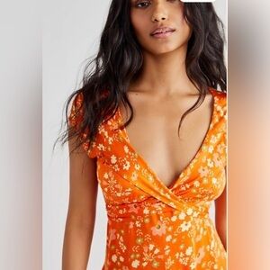 Free People It Takes Two Floral Print V-Neck Open Back Dress in Peach Combo Sz M