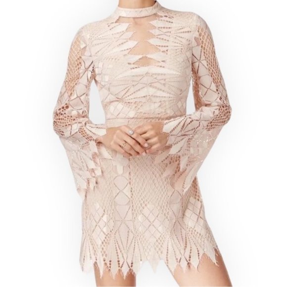 Free People Ivory Beige Deco Lace Cutout Eyelash Hem Bell Sleeve Mini Dress - 8*