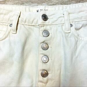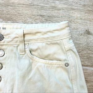 This Free People “We The Free” ivory denim miniskirt blends effortless cool with a vintage edge. Made from sturdy cotton denim, it features a flattering high-rise silhouette, light distressed details, and a raw-cut hem for a worn-in look. The exposed button fly and seamed paneling add structure and charm, making this the perfect casual staple to pair with tees, tanks, or boho blouses.