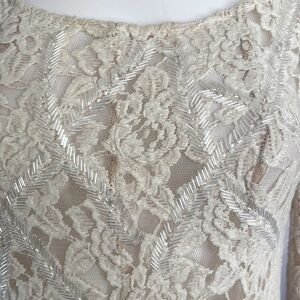 Beaded in front chest area. Will need slip. Beautiful two different kind of lace. Perfect with heels or booties. Sandals would work as well. Could also add a belt for a different look. Measurements taken laying flat and approximate.
