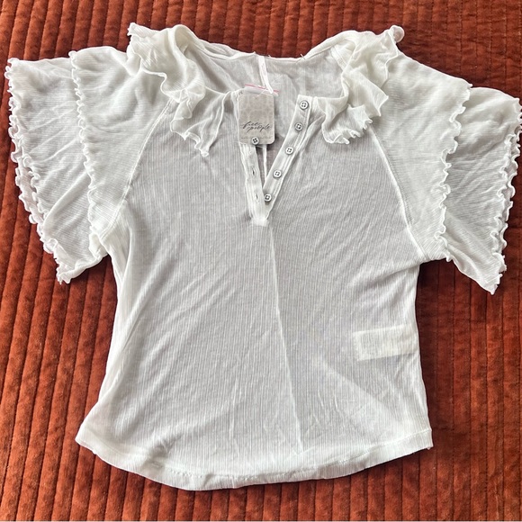 Elegant ivory blouse with ruffled sleeves. Button-up front adds charm.