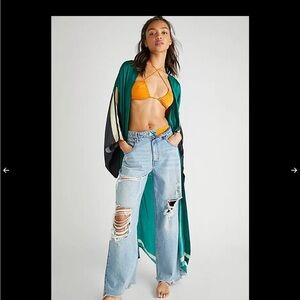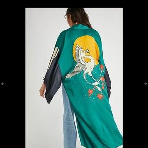 Vibrant robe with colorful design. Silky fabric and wide sleeves. Perfect for a bold look.