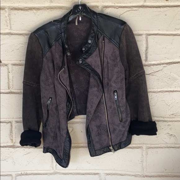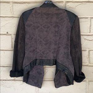 Black and grey with flower print moto jacket by Free people. It is a combination of cotton and vegan leather. The back of this striking jacket is dramatically cropped creating a very attractive and flattering line just above lower back. Great for dressing up as well as dressing down.