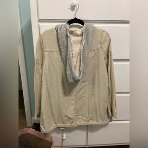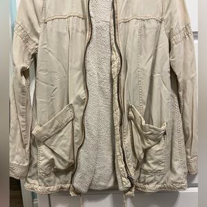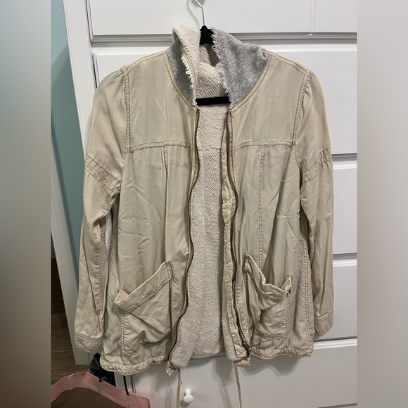 Free People lightweight zip up jacket. The sleeves are very lightweight and then the middle part is a little heavier / warmer. In very good condition, the photo just looks wrinkly.