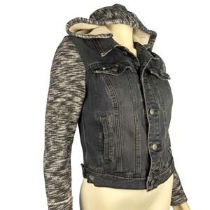 Features a black wash denim body with marled gray knit sleeves and a cozy removable knit hood. Designed with a cropped cut, button front, chest flap pockets, and side slit pockets. Distressed detailing gives this jacket a worn-in, vintage vibe. Hood is attached with interior buttons for easy removal.