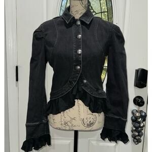 Shell: 77% cotton, 23% polyester. Trim: 100% viscose. Ruffle layered trim at hem and cuffs. Four large metal button front closure. Peplum hem detail creates a feminine silhouette. Lightly distressed black wash denim with tonal stitched seams. Puff shoulder detail for added shape. Fitted cropped style.