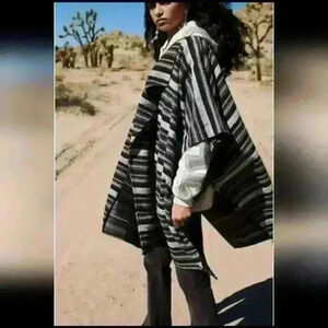 Features: Open-front design, woven fabrication, split sides, wide collar, relaxed sleeves, striped pattern