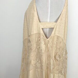 Free People Jar of Hearts Cream/Beige Midi Dress With Halter Neckline Vacation Beach Summer. Crew neck, sleeveless, cutaway shoulders with side strap detail, beautiful netted flower embroidered center panel, pleated hem, slips on over head, lined. Material: shell: 100% cotton, lining: 100% rayon, trim: 67% cotton, 33% nylon. Very good pre-owned condition, clean.