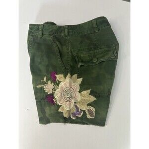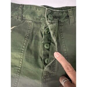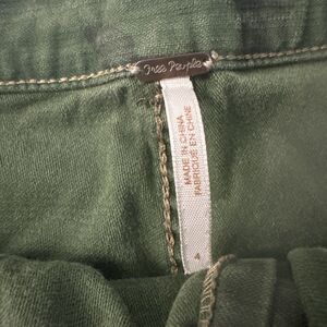 The product is a pair of women's green high-rise button fly denim shorts from the brand Free People. These embroidered and raw hem shorts feature a comfortable and easy-care fabric blend, with a stylish cut-off style and slash pockets. The garment is suitable for occasions such as travel, parties, casual wear, and various outdoor activities, making it a versatile addition to any wardrobe. With a size 4 waist and a 5-inch inseam, these shorts are perfect for the summer, fall, and spring seasons, adding a touch of festival, bohemian, and modern flair to any outfit. Measures 27 waist, 10.5 rise, 5 inseam and 14.5 total length. Excellent condition