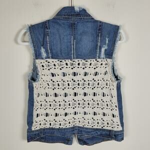 Free People Jean Vest Small Blue Denim Distressed Moody Macrame Crochet Boho