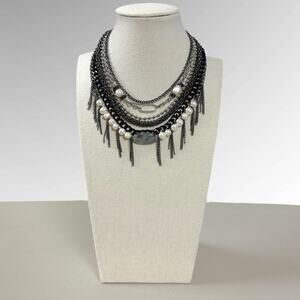 Features: Layered choker style, mixed-chain design, pearl details, stone pendant, chain fringe, adjustable clasp closure