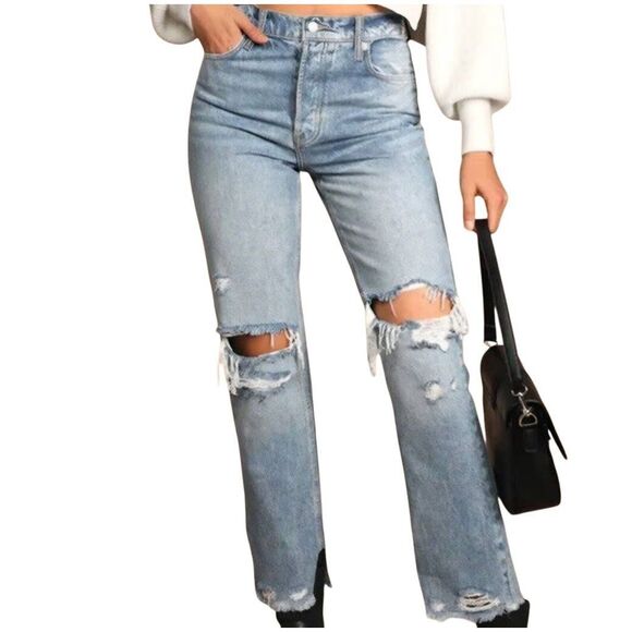 Free People Jeans Women's 26 Blue Tapered Baggy Boyfriend Ripped Raw Hem