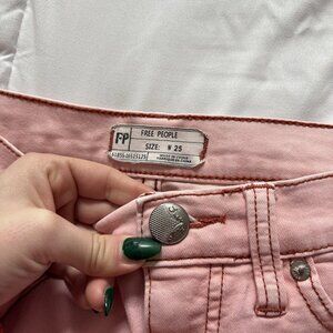 The product is a pair of Free People women's jeans in a coral pink color, size W25.