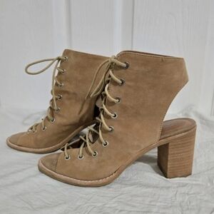 This is a pair of Free People + Jeffrey Campbell women's heeled sandals. Size 9.5. They have a soft suede tan material with a lace-up wrap around body that goes a little higher than the ankles. Open-toe. These have been worn a few times but still in great condition. Has some typical wear but no major issues. See pics. Perfect for a semi-casual outfit, workwear, evening out, bohemian, etc. Please note that the very first picture is for reference only and may not be exact to the item being sold.