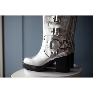Features: Tall style, pull-on design, leather uppers, square toe, slight platform, chunky block heel, o-ring harness detail, buckle details