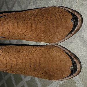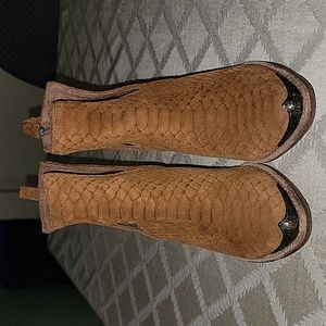 In very good condition. Worn about 5 times. Boot have signs of use. They have sole and heel wear. Some scuffs/scratches on heel. No stains. Only flaw is that the left pull tab ripped half way...see photo provided #14. Inside is clean. Size 7. Color is Tobbacco Snake Print.