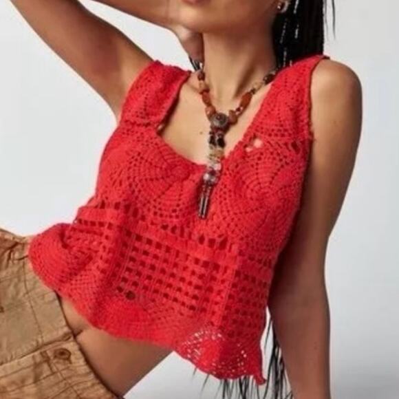 Free People Jen’s Pirate Booty Crochet Nelli Top Red Coral Large NWOT