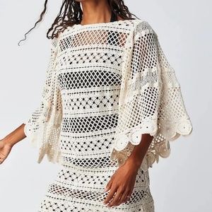 Features: Exaggerated flutter sleeves, classic crochet fabrication, low scoop back, scalloped hems at sleeves, semi-sheer style