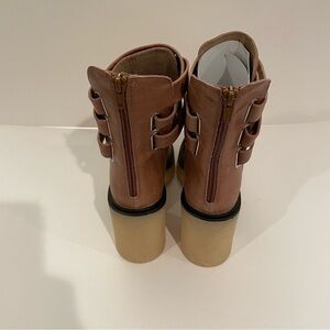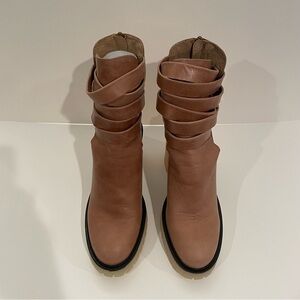 Platform boot from Free People. Buttery soft leather upper. Strappy ankle details. Zip closure. Lightly cushioned footbed. Lug sole. 3-3/4" block heel.